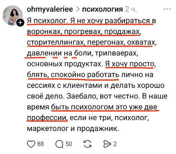 Но вместо помощи людям тебе приходится работать маркетологом, рилсмейкером, копирайтером, продажником…